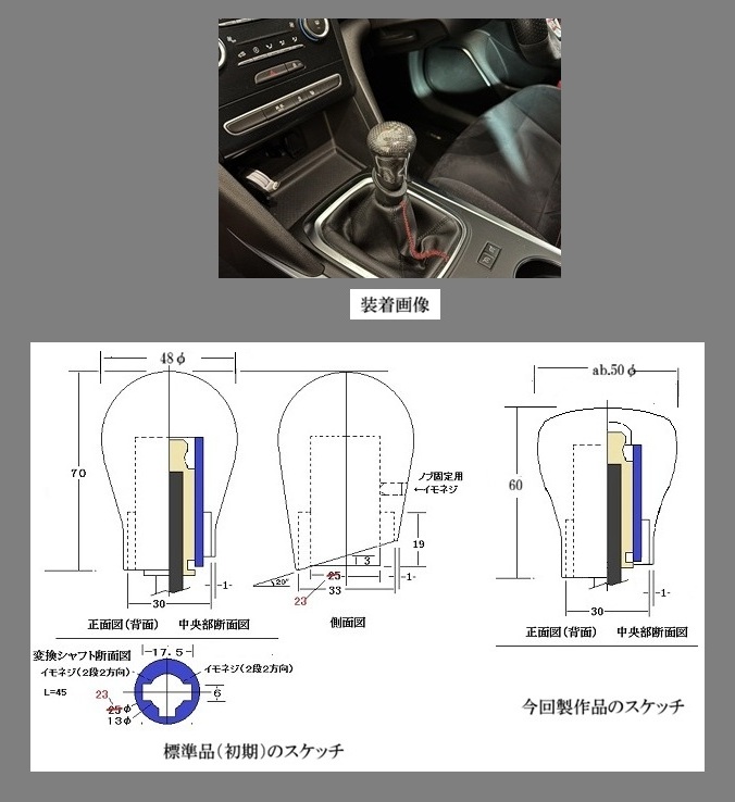 御買い上げ実績(お取付の車名、メーカー名) ヘビーウェイトシフトノブの効果について(特別掲示) MTにおけるヘビーウェイトの効果を解り易く解説しています。 5MTシンクロメッシュ MT愛好家には興味深いシンクロメッシュの構造を理解しやすい図として描きました。(拡大してご覧ください) 合わせて、“シフト操作が重い!シフトが入りにくい!”、 何故? ![]() BLOG ( 走れ ! ポンコツ ) 筆者の日記的内容の一方的な公開です。テーマは題名の通り、走ること(ジョギング)に絞っています。 以下に、ご購入いただいた方々からのインプレ等を掲載しています。 TOPICS(5) (最新) メガーヌ6速 伊勢崎市のSさんからはメガーヌ用に準備している標準的な仕様(数件下のトピックス)をベースにノブの高さを60mmにしてかつ究極のローポジ仕様にしたノブのご注文を頂きました。勿論、操作性の改善が目的ですから必要な重量確保は暗黙のご要望とお察しました。完成したのは標準品比べて天部を10mm低く、 大幅にフラット化し、また、重量確保を目的に直径を2mmほど拡大(50mm弱)したシフトノブ。 大幅な納期遅れで大晦日のお届けになったにもかかわらず、その日のうちに取り付け、試乗され、以下のインプレまで送って頂きました。 重量が増すことによる操作が軽くなることに加えて、純正のシフトノブよりも取付け剛性が高いことでシフトの位置が明確になり、シフトフィールが大幅に改善されました。FR車に乗り続けてきたので、メガーヌのシフトフィールの曖昧さが気になっていましたが、製作いただいたシフトノブである程度改善することができたので満足しています。 標準品に比べ、こちらの方が製作の難度はかなり高いのですが、ノブ高さ等はより優れているのではと考え、トッピクスに掲載させて頂こうと、装着画像の提供をお願いしたところ、また即刻に追加のインプレとともにお送りいただきました。 ![]() シフトノブ交換による特に大きな効果として、横Gが掛かった状態で2→3速にシフトする際にミスしにくくなったと感じます。また、街乗りでギアを飛ばしてシフトする際にシフトの位置を見失うことがありましたが、剛性が上がることによるフィールの改善で思ったギアに入れやすくなりました。 なお、ノブ全高の変更(70→60mm)でシフトノブの高さとしては、ほぼ純正と同じくらいの高さでの取付けとなりました。 心より感謝申し上げます。色々と有難うございます。(1月2日深夜) シビックTypeR 宇治市のKさんからはTypeR用に3層構造カーボン500g球形ノブのご注文を頂きました。お受け取り後すぐに、取り付け、試乗され、 以下のインプレと画像をお送りいただきました。 『取付けできました。純正より重く、元々球タイプが好きなこともあり、すごくシフトチェンジがしやすかったです』 ![]() シビックでのご注文はあまり多くはなく、本HPへの掲載事例も殆どない〈ハズ〉ことに加え、お送り頂いた装着画像の中のカーボン柄やシフトパターンが余りに奇麗に写されていましたので、HPへのアップにつきお願いし、快諾頂きました。 自分では(最近は)カーボン柄が明確に写った奇麗な画像は撮れませんので、ご使用のカメラを訊ねてみましたところ、極一般的なスマホ、但しiPhone とのことでした。 製作に時間が取られることもあって、ノブの撮影からはすっかり遠ざかっていますが、復活してみようかな?(但しiPhone ではありません) アルファ156変換シャフトタイプ 横須賀市のNさん。お届けが(納期遅れで)12月30日になったにもかかわらず、 翌大晦日には装着画像やインプレをお送りいただきました。 インプレは 『操作インプレですが、最高です! 程よい重量(約500g仕様)でシフトの入りがとてもしっくりきます。 純正に比べて少しショートになりましたが、むしろ良いです!』とのこです。 ![]() 年末のお忙しい中、本当にありがとうございます。 国産車でのMT車の新車は少なくなりましたが、国産車のみならず輸入車でもまだまだMT愛好の方が多くいらっしゃるようで、いつも忙しく対応させて頂ています。 カングー変換シャフトタイプ 大田区のTさんからはカングー用のヘビー車ウェイトノブのご注文を頂きました。レバーシャフトの上部がT型断面を持つプラスチック製で、 リバースプルリングのないシフトノブでした。簡単なつくりではT型断面が内接するシャフト穴(17mmφ)とイモネジを4ヵ所(120度離角して2か所、2段)設けることが 合理的なのですが、ノブ表面に4ヵ所もの穴ができます。 これを避けるため、当HPではプラスチック部分を外形23mmのシンプルな円柱シャフトに変換する(円柱シャフトを被せる)手法を取ります(イモネジにより4ヵ所固定)。 そしてノブとの固定は他の1本のイモネジのみで行っています。 ノブ表面のイモネジ穴が1ヵ所であることに賛同いただいたご様子で、構造的には当方の案に沿ってご注文頂きました。製作したのは画像のシフトノブ。 ![]() Tさんからは以下のインプレも頂きました。 何度も微調整くださ